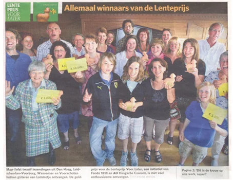Noot: de lenteprijs 2009 van 5000 euro is gewonnen voor het project ‘Mobiele volkstuin light’, hiervan is het project de mobiele apotheek gerealiseerd. Het Panderplein project wordt inmiddels door meerdere geldgevers ondersteund waaronder Fonds 1818….